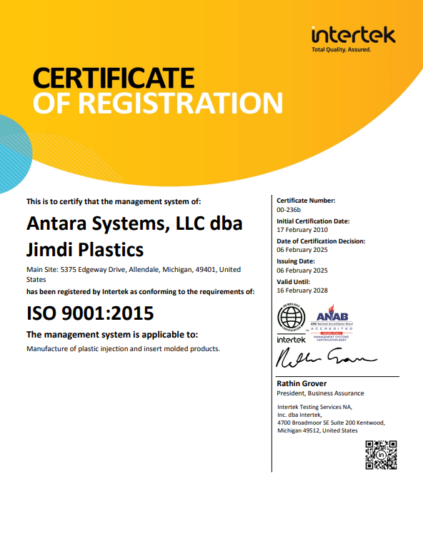 Jimdi Plastics is an ISO 9001:2015 certified company.